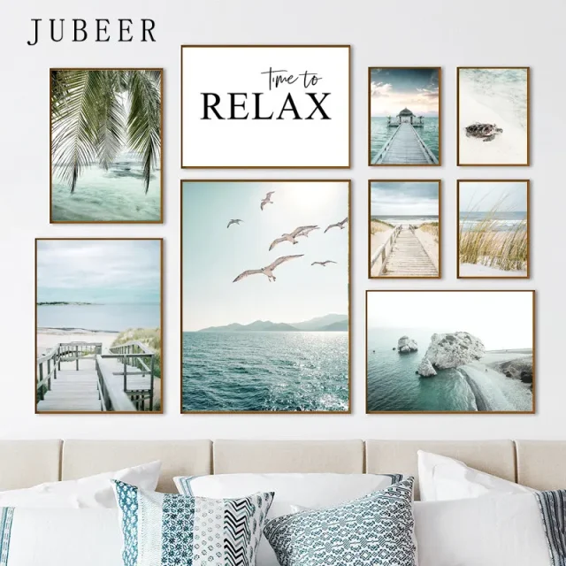 Beach Sea Ocean Poster Wall Art Canvas Painting Bridge Leaves Turtle Seagull Print Vibrant Summer Picture Nordic Home Decoration