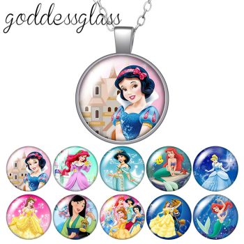 Princesses Snow white Belle Elsa Mermaid Round Glass glass cabochon silver plated/Crystal pendant necklace jewelry for Gift