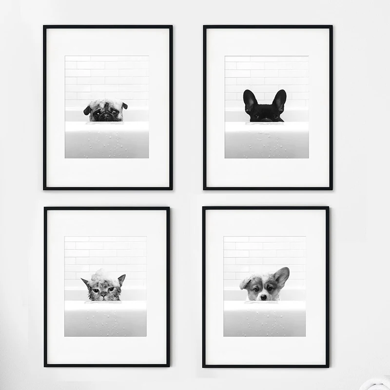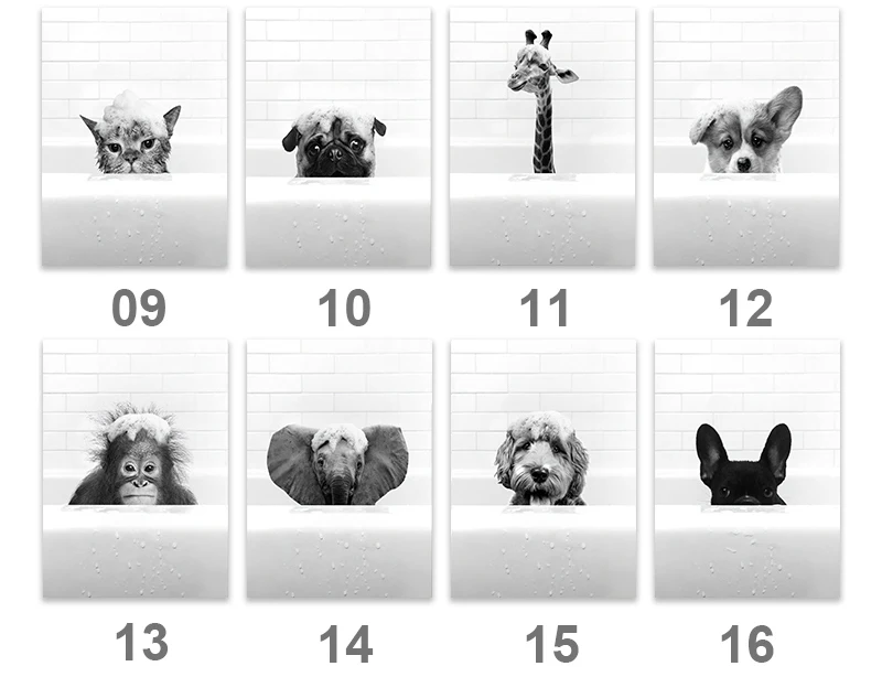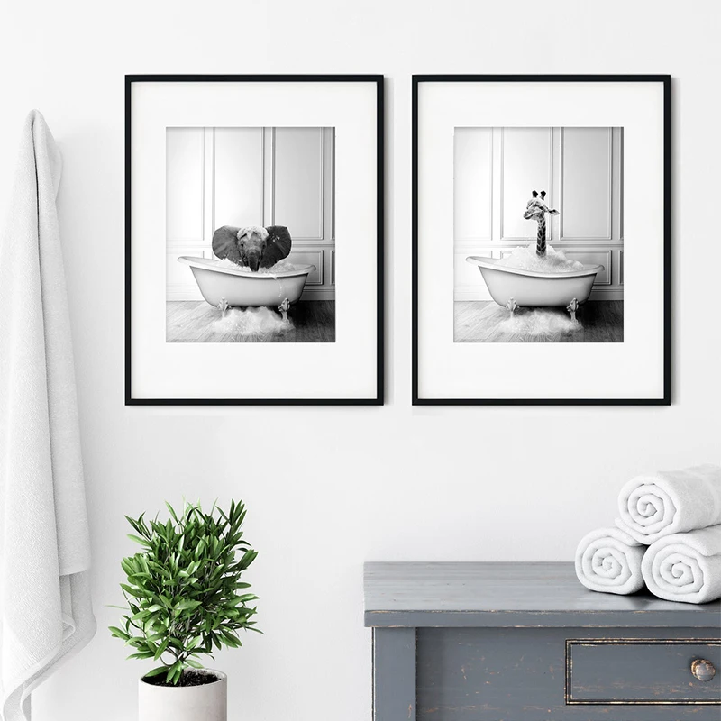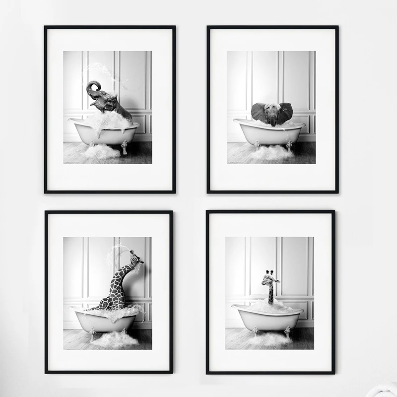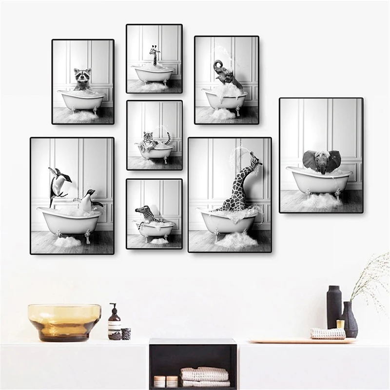 New Arrival Black White Animals In Tub Bathroom Wall Art Canvas Painting Posters and Prints Wall Pictur for Room Decor One Piece